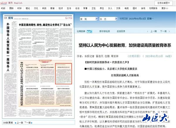 3月13日,《光明日报》第4版“要闻”刊发新闻通讯《坚持以人民为中心发展教育,加快建设高质量教育体系》,就“培养复合型公共卫生人才”专访全国人大代表、农工党山西省委会副主委、我校校长解军。