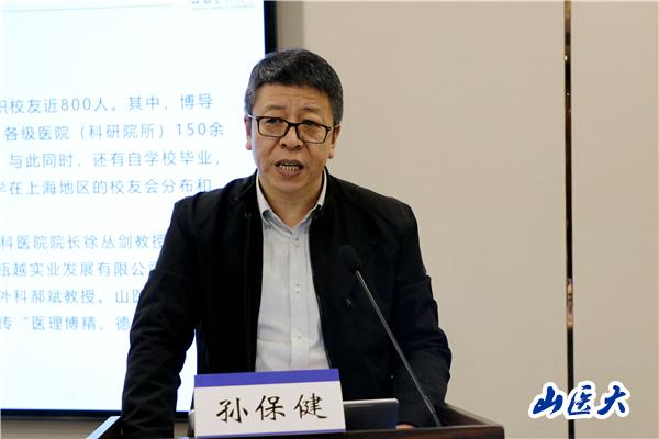 上海校友会常务副会长孙保健致欢迎词并介绍了校友会的发展历程。他指出,上海校友会成立九年来,始终以母校恩师们手口相传的“医理博精、德能高邃”校训为指引,秉承“献身、务实、团结、进取”的校风,积极为广大在沪山医校友搭好平台,做好服务。