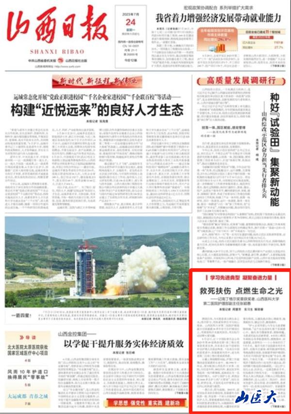 7月24日,《山西日报》头版“学习先进典型 凝聚奋进力量”专栏以《救死扶伤 点燃生命之光——记南丁格尔奖章获得者、我校第二医院护理部副主任张颖惠》为题,专题报道了我校第二医院张颖惠同志的先进事迹。