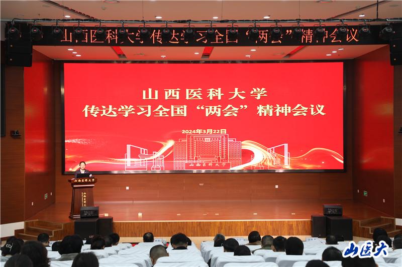 3月22日上午,我校召开了传达学习全国两会精神会议。会议邀请全国人大代表、山西白求恩医院重症医学科党支部书记、副主任杨晓静和全国政协委员、我校第一医院副院长韩清华,为大家传达解读全国两会精神。校领导,第一医院、第二医院班子成员,全校处级干部、省纪委监委驻校纪检监察组处级干部,民主党派和统战团体负责人,思想政治理论课教师、思想政治辅导员、分团委书记、学生代表等参加了会议。校党委副书记彭月兰主持会议。