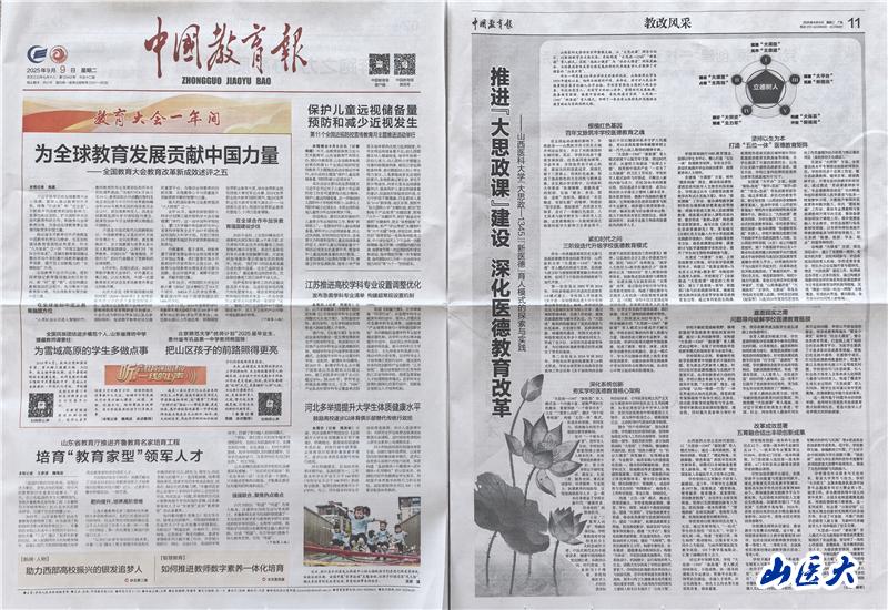 9月9日,《中国教育报》“教改风采”版刊发我校党委书记王军、校长解军的署名文章《推进“大思政课”建设 深化医德教育改革——国产亚洲精品美女久久久_99久无码中文字幕一本久道_亚洲成AV人影院_亚洲AV影院一区二区三区 狠狠躁夜夜躁人人爽天天不卡_国产激情久久久久影院老熟女_精品性高朝久久久久久久“大思政—1345”“新医德”育人模式的探索与实践》。