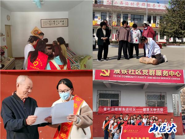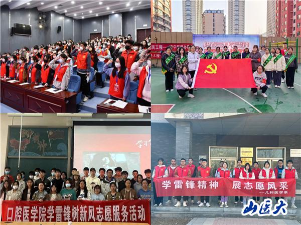 校团委广泛组织各级志愿服务组织和社区进行对接并开展志愿服务活动,校志愿者服务总队、第一临床医学院、第二临床医学院、第三临床医学院、第五临床医学院、基础医学院、法医学院、口腔医学院、护理学院、公共卫生学院、麻醉学院、管理学院、人文社会科学学院、体育教学部等院系志愿者积极走进太原市万柏林区纺织街社区、丽华苑社区、迎泽区解放南路二社区、老军营二社区、小店区平阳二社区、杏花岭区各社区、晋中市榆次区辽阳路社区、安新社区、液铁社区和北部新城高校园区社区、小西沟村党群服务中心、山西省政务中心、太原市晋源区法院、晋中市科技馆等社区和场馆开展义诊、健康知识宣讲、社区和街道环境维护、急救知识培训、文档整理以及残疾人、孤寡老人、空巢老人和孤残儿童帮扶和困境青少年心理疏导等志愿服务,用自己的汗水和爱心传承雷锋精神,续写雷锋日记,用实际行动传播“我为人人、人人为我”的社会文明风尚。