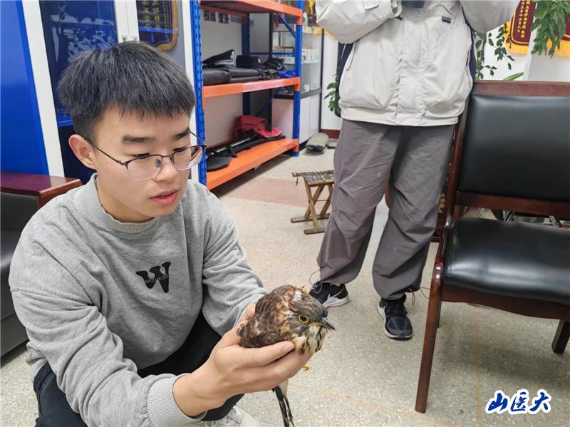 近日,我校药学院临床药学专业2023级学生王佳城在中都校区校园内救助了一只受伤的国家保护动物大鹰鹃鸟,得到晋中市野生动物保护站和驻校民警的称赞。