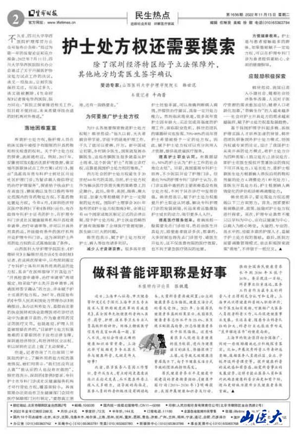 近日,《人民日报》主办的《环球时报》旗下《生命时报》记者采访了我校护理学院院长韩世范教授,就护士处方权进行了专家解读。
