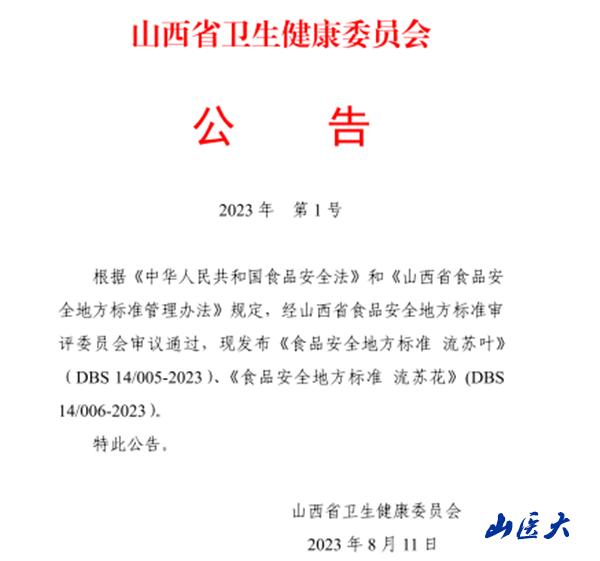 2020年,山西省卫生健康委员会立项《食品安全地方标准 流苏叶》《食品安全地方标准 流苏花》,我校营养与食品卫生学学科带头人、山西省营养学会理事长邱服斌教授担任项目负责人。经现场考察、资料收集与调研、样品采集检验、标准起草、意见征求和山西省卫生健康委员会审查评议,历时两年多,成功发布这两项标准。