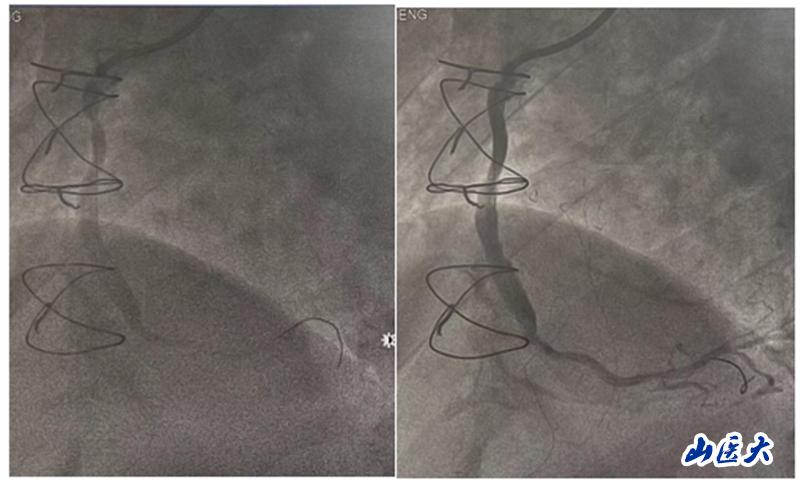 在手术中,团队发现患者的前降支、回旋支口部和右冠脉近段均存在闭塞情况,升主动脉-右冠脉桥血管近端狭窄约90%。团队决定对升主动脉-右冠脉桥血管进行介入治疗。他们快速准确地判断了病变血管的范围,并选择了激光消蚀辅助以及合适的球囊和支架进行干预治疗。手术后,患者安返病房,未再出现胸闷及气紧等不适症状。