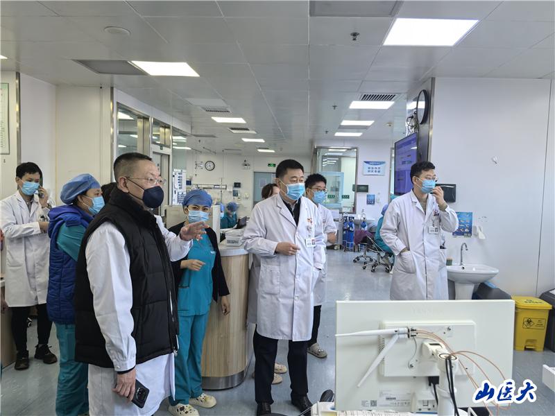 赵斌一行重点检查了急诊、重症医学科一病区、重症医学科三病区等医疗救治的关键区域,他强调,要持续优化门诊和住院服务流程,确保患者在紧急情况下能够得到及时有效的救治。要做好充分的医疗物资储备工作,以应对可能出现的各种紧急情况。各职能部门要全力做好医务人员的后勤保障工作,确保大家在值班期间能够安心、舒心、暖心地工作,为患者提供优质的医疗服务。