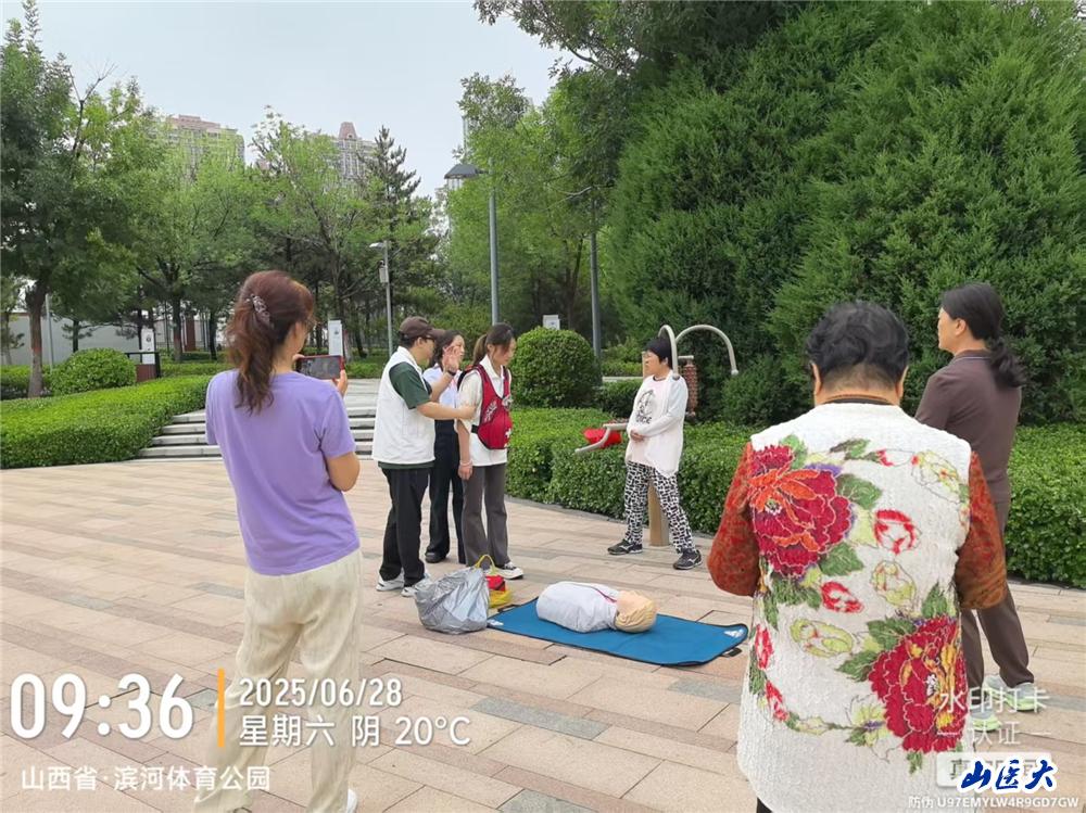 雨后的滨河体育公园气温适宜、空气清新。李星、王朝霞、姚怡帆、申芸蕊四名志愿者通过理论讲解与实操演示相结合的方式,详细介绍了心肺复苏术、自动体外除颤仪(AED)的使用、海姆立克急救法等急救技能。