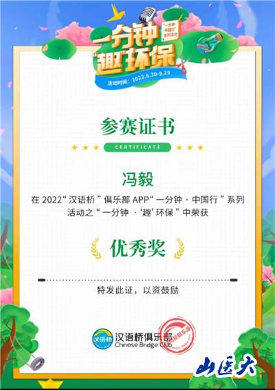 喜讯!我校国际学生冯毅在汉语桥“一分钟·‘趣’环保”中文挑战活动中再获佳绩
