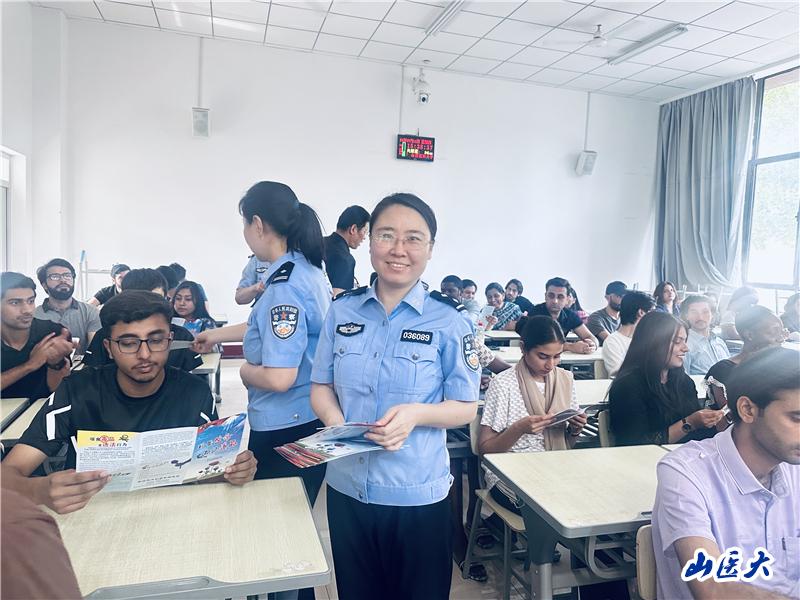 晋中市高校分局李卫国副局长介绍了高校分局来华留学生日常管理工作职能和工作要求。晋中市高校分局治安大队王晓锋副大队长就我国的涉外管理机构、相关法律法规以及来华留学签证手续办理注意事项等相关政策进行了宣讲。张颖大队长详细介绍了“三非”案件(非法居留、非法就业、非法入境)的危害和法律责任,强调了留学生应严格遵守中国的出入境管理法规,对相关法律法规的内容和适用范围进行了详细说明。讲座结束后,警官们向留学生发放了禁毒宣传手册,并就留学生的提问进行了耐心细致解答。