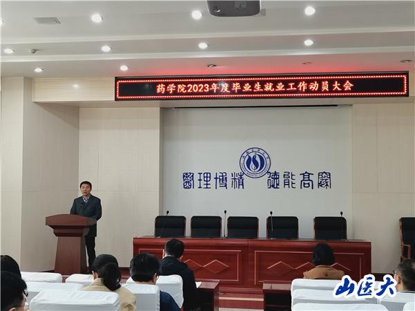 会上,郭建锴详细解读了当前的就业形势和就业相关政策,通报了药学院2023届各专业毕业生的升学率及就业情况,从不同的角度分析影响毕业生目前就业困难的原因,并通过具体的求职案例为药学院毕业年级的辅导员、毕业生指导老师提出了宝贵建议。他指出,为了帮助毕业生尽快就业,学校将充分挖掘我校校友以及其他社会资源,积极拓宽毕业生就业渠道,全方位行动提高毕业生就业率。