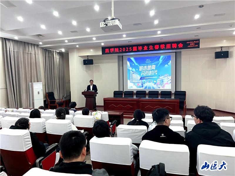 4月2日,我校药学院2025届毕业生春季招聘会在中都校区举办。亚宝药业和鲁南制药招聘负责人、药学院党委副书记童玲、药学院就业专员姜敏及2025届毕业生参会。